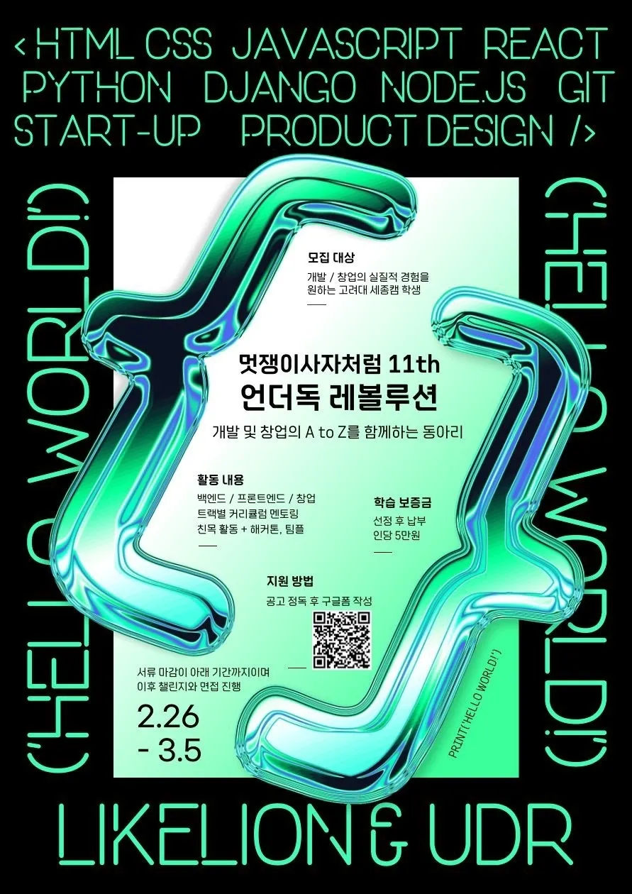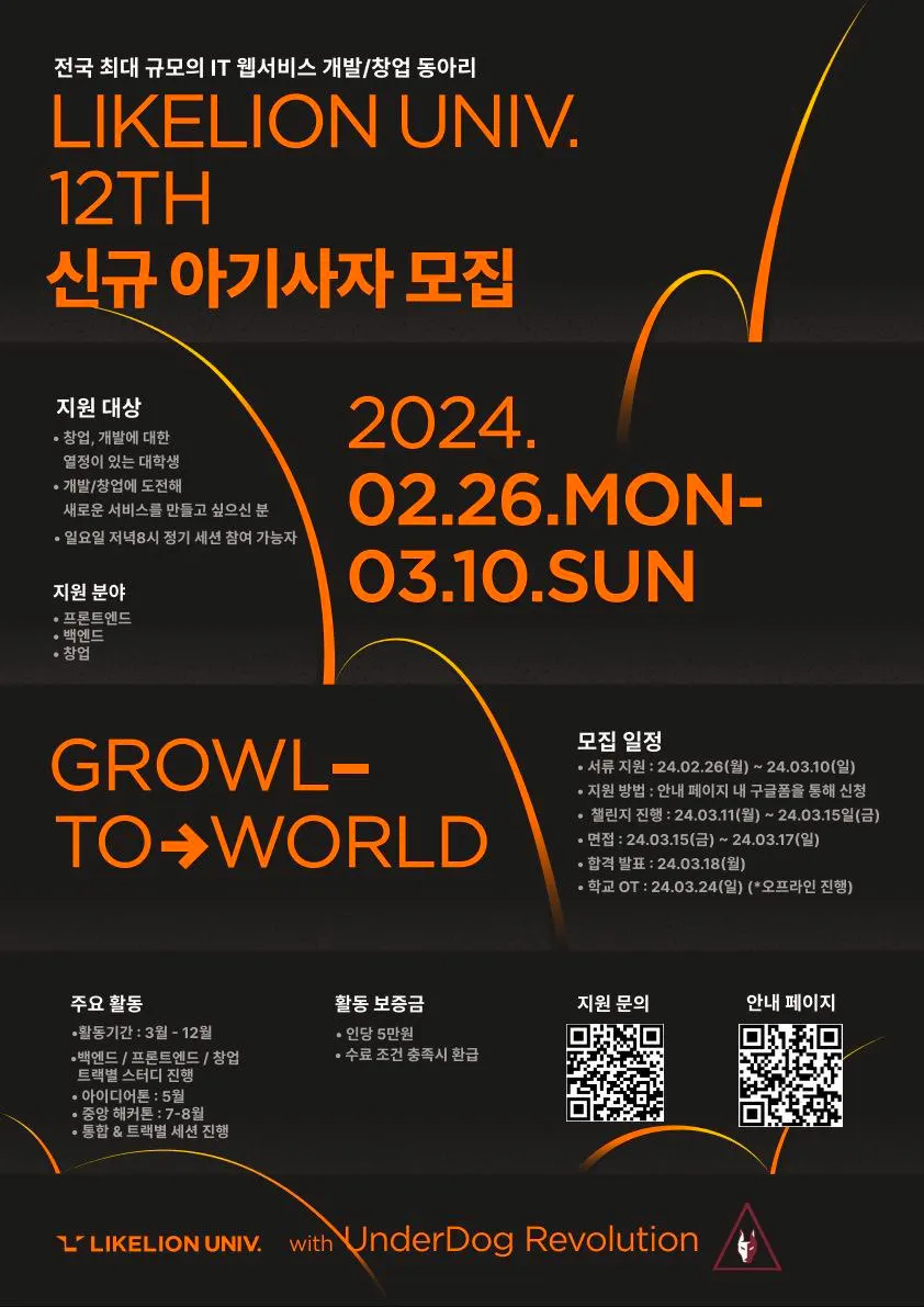 (with. UnderDog Rev)에서 12기 신입 부원을 모집합니다!멋쟁이 사자처럼은 전국 61개 대학이 모인 전국 최대 규모 개발/창업 동아리입니다.