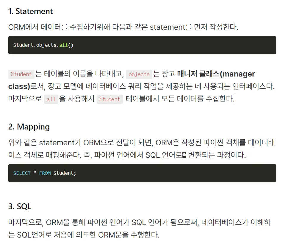 장고 orm덕분에 sql문을 사용하지 않아도 데이터를 다루고 관리할 수 있음
