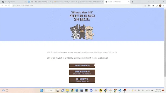 장서영 역할 : 기획, 테스트 문항 작성, HTML&CSS 작성, SNS 공유 기능 구현 포트폴리오 : https://github.com/jangseoyoung98