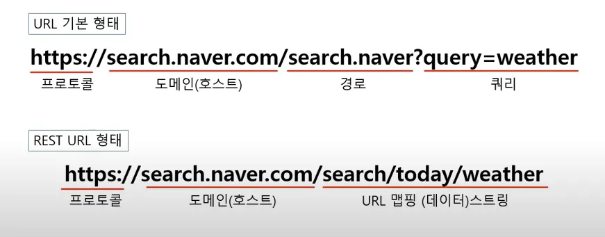 URL 기본 형태 : Server 진입 (프로토콜, 도메인) → Server 안의 경로 → 요청문 (쿼리)