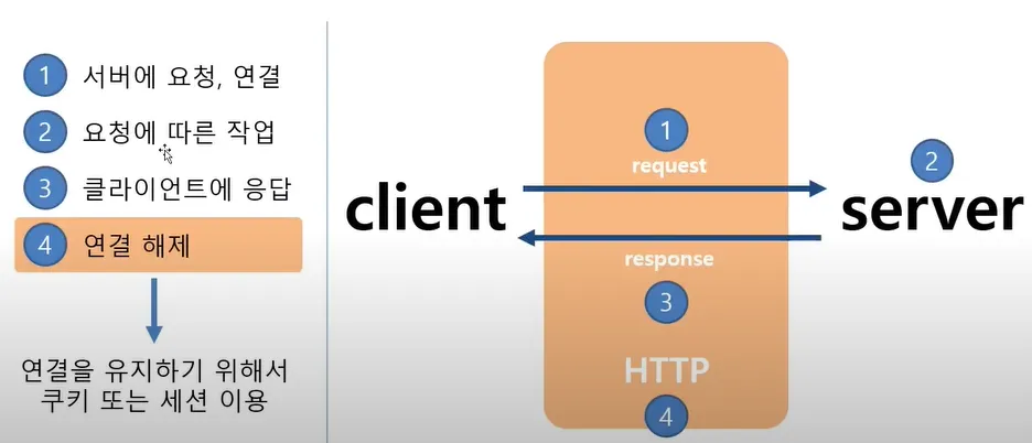 Client가 Server에 요청 → Server가 요청에 맞는 기능 수행 → Server가 Client에 응답 → 연결 해제