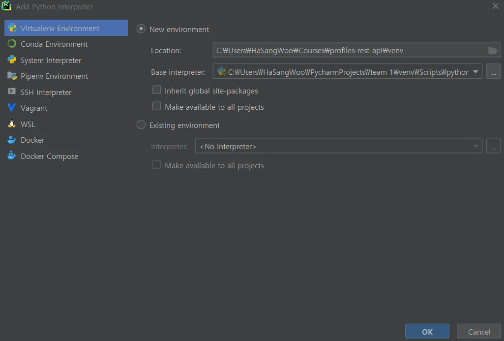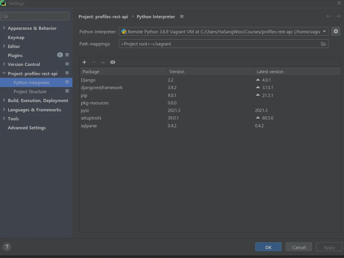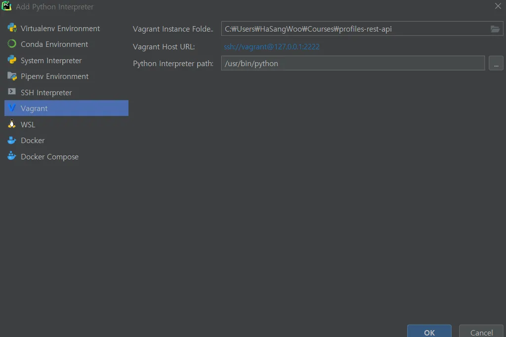 파이참이라는 ide에서 내가 지금 vagrant라는 서버에 가상환경 만들어서 django 패키지 다운 받고 사용하니, 거기 가상환경의 것들을 사용할 수 있도록 설정해주면 됨