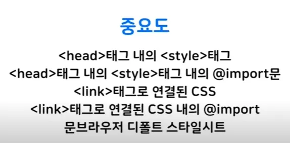 중요도 : css가 선언된 위치에 따라 중요도가 달라짐. 가장 우선순위는 <head>내의 <style>