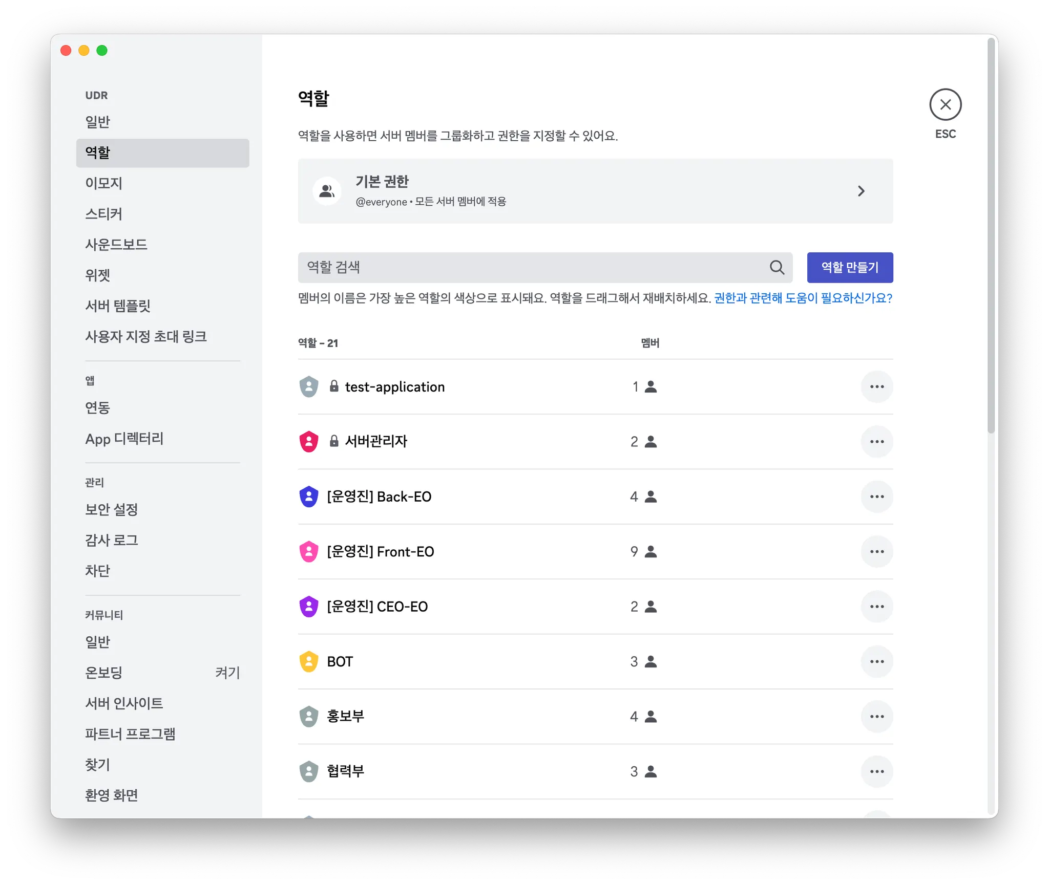 모든 역할 관련 설정은 서버 설정 - 역할에서 관리할 수 있습니다.