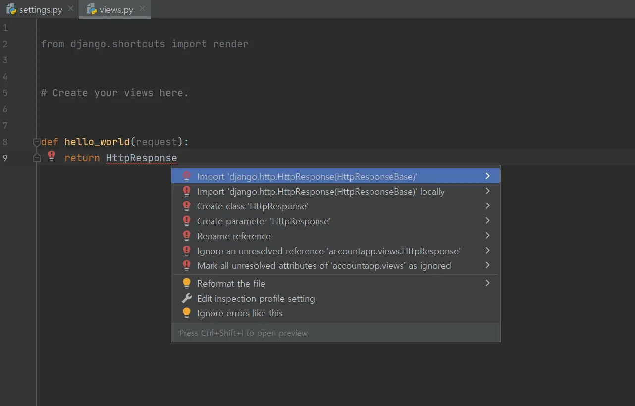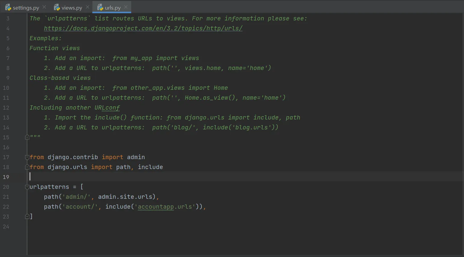 → accoutapp의 path에 해당하는 view를 가져와 되돌려주는 역할을 하게 된다.