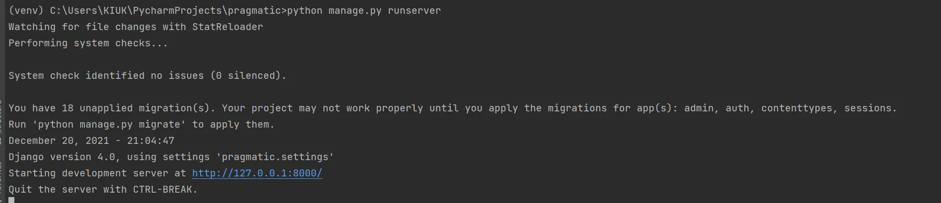 ⇒ 설치되어 있지 않다면, 장고 설치 [pip install django]