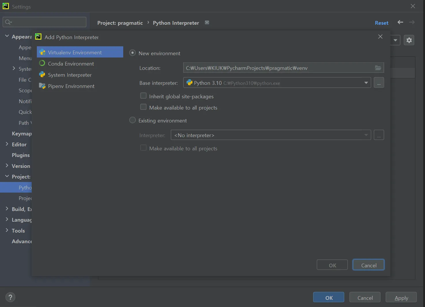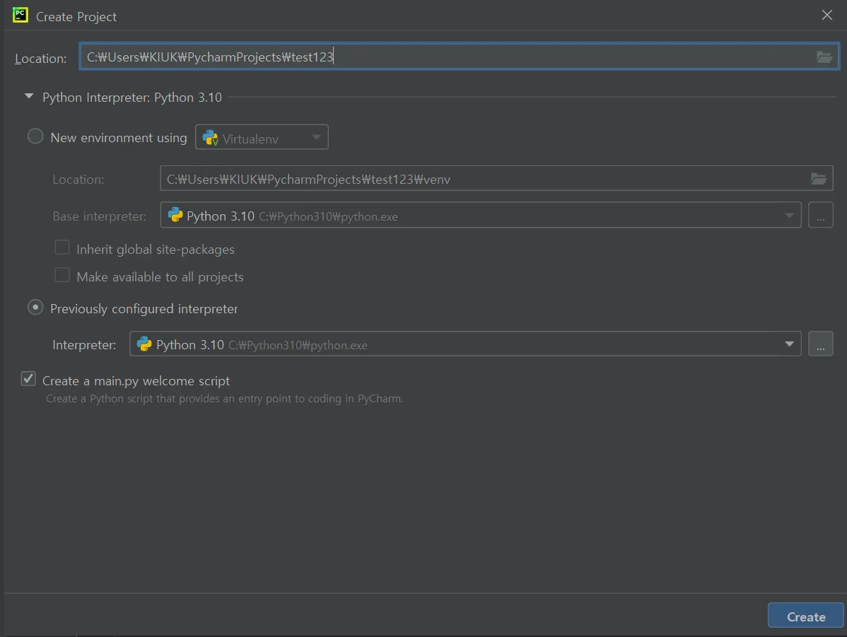 setting - projec interpreter - add로 격리된 가상환경 공간 생성
