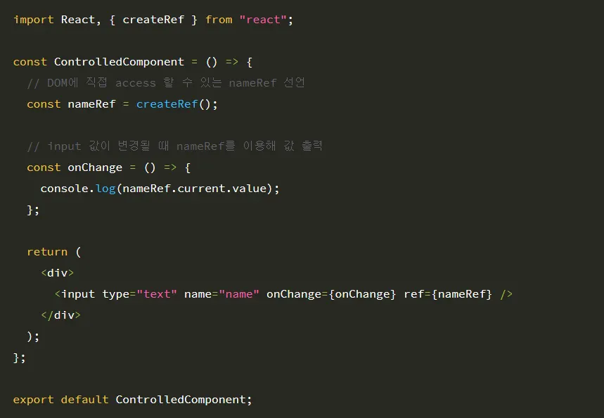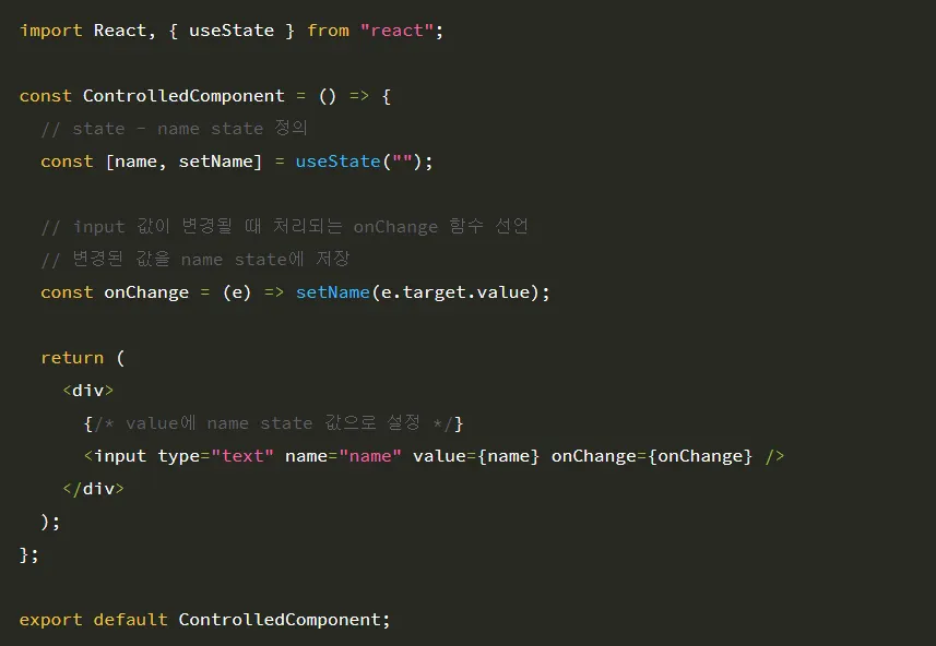 <input> 태그를 제어 컴포넌트로 사용하는 예를 들어보면, value 값을 useState로 관리하는 것이 대표적인 제어 컴포넌트의 예시입니다.