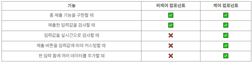 리액트 개념에 의해 관리되는 것이 제어 컴포넌트이고 그렇지 않은 것이 비제어 컴포넌트이다.